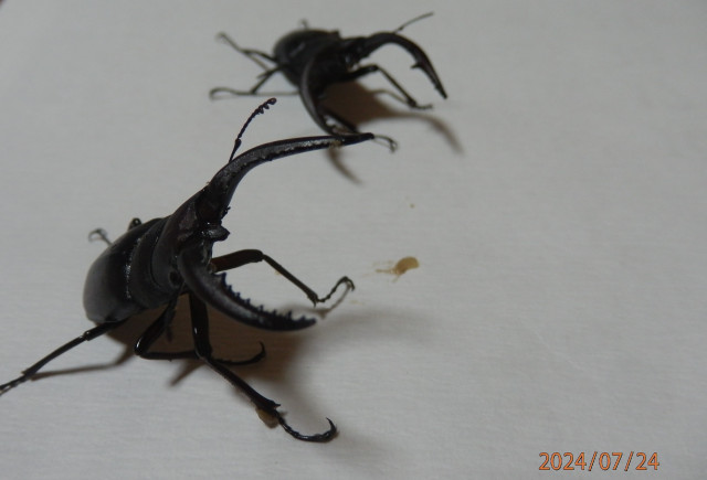 以前、飛んできたカミキリムシをクワガタと同じバケツで飼っていましたが、朝に見ると、むざんやなクワガタにかみ砕かれてバラバラになっていました。好物のバナナ🍌の取り合いでした。