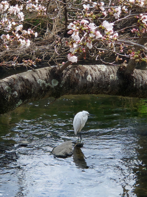 サクラの下にシラサギ(コサギ)が・・・のどかですね。