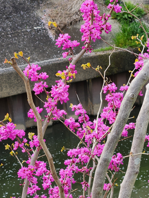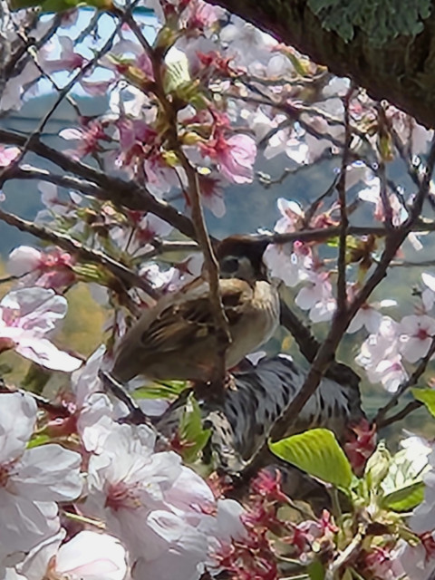 7割がた散っています。 それでも今年のサクラを惜しむように、僅かですが花見をしている母娘がいました。