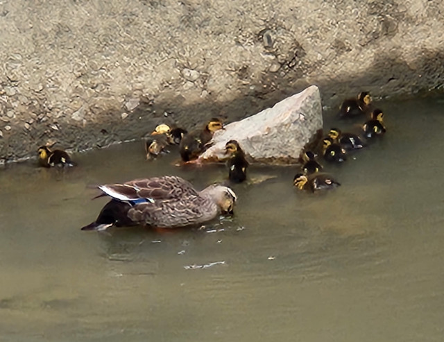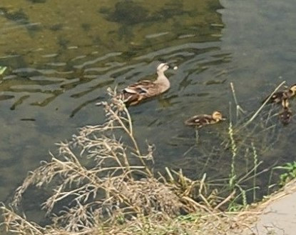 ヒナを3羽連れて泳いでいました。写真撮ろうとすると草むらに隠れて出てきません。