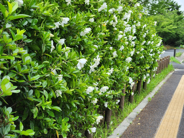 街路樹のクチナシが一斉に咲き始めました。散歩の楽しみです。