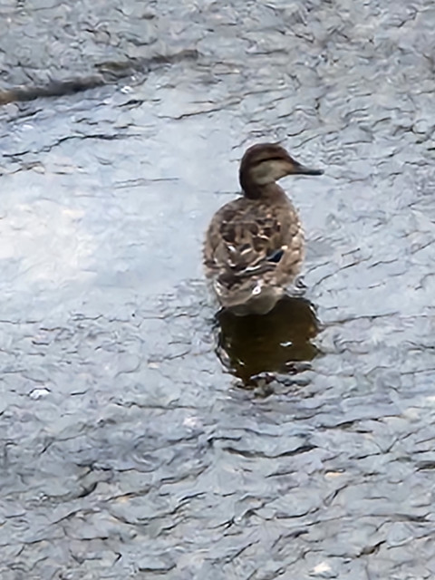 カルガモの群れに渡り鳥(コガモ)が混じっています。