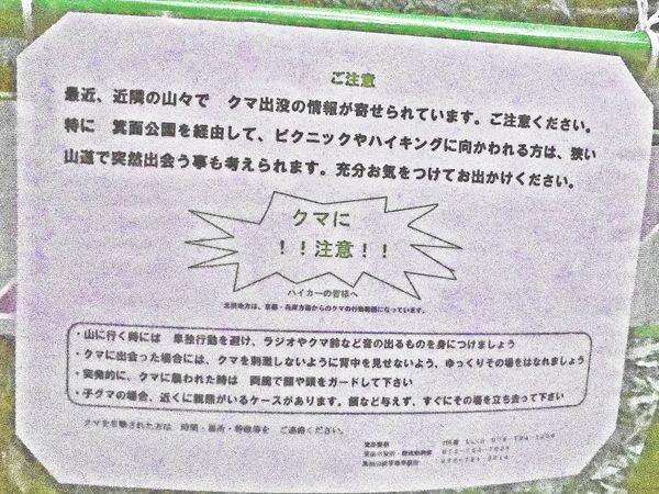 箕面の滝散歩コースに熊出没 「クマ!!注意!!」の貼り紙です。