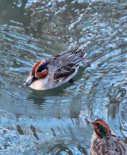 やっとコガモのオスに婚姻色が出てきました。目のまわりに緑のアイラインが、サトテルか森下みたいです。