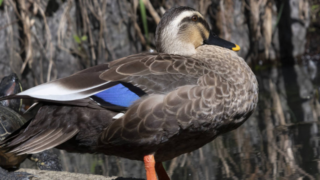 カルガモの横腹に青く光っているのが翼鏡と呼ばれています。