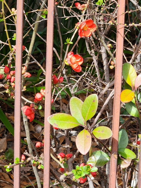 赤いボケが咲き始めました。朝の散歩が楽しみです。