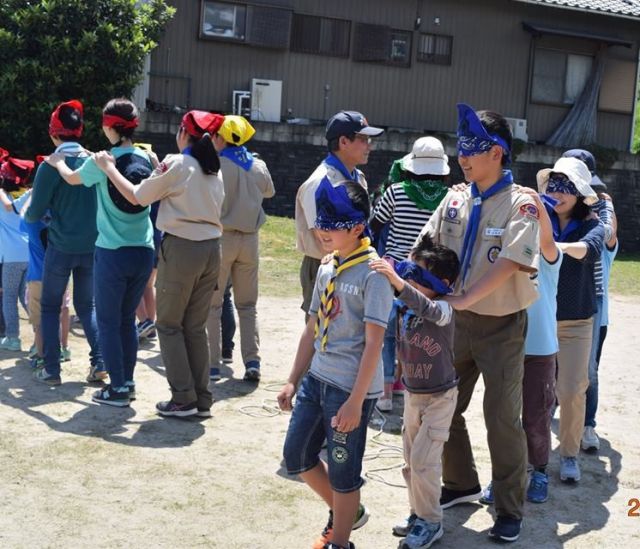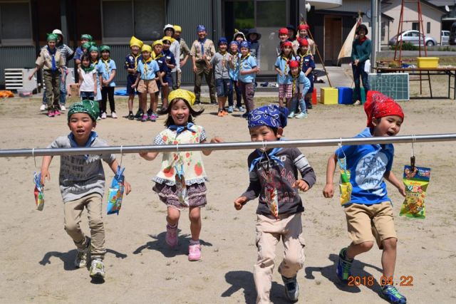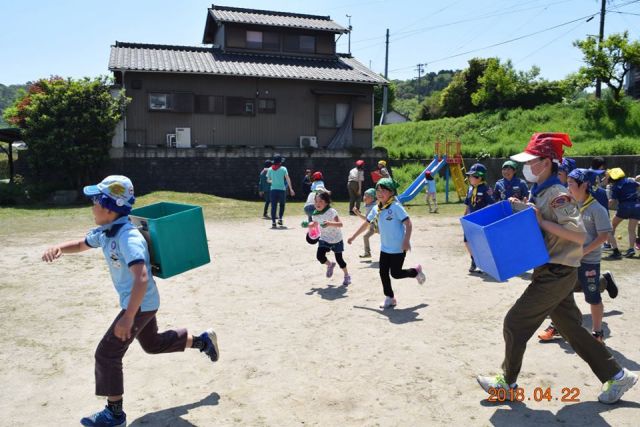恒例のミニ運動会を開催し、団家族の絆を強めました。運動会種目は、スカウト風にアレンジした「二人三脚」・「逃げかごシュート」・「ムカデ競走」・「菓子食い競走」を展開しました。{emoji index="216"}