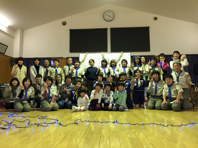 また、昔遊びとして、福笑いや紙相撲、コマ回し、竹馬などをしました。紙相撲はトーナメント方式で展開しましたが、スカウト達は大声援の中でがんばりました。
