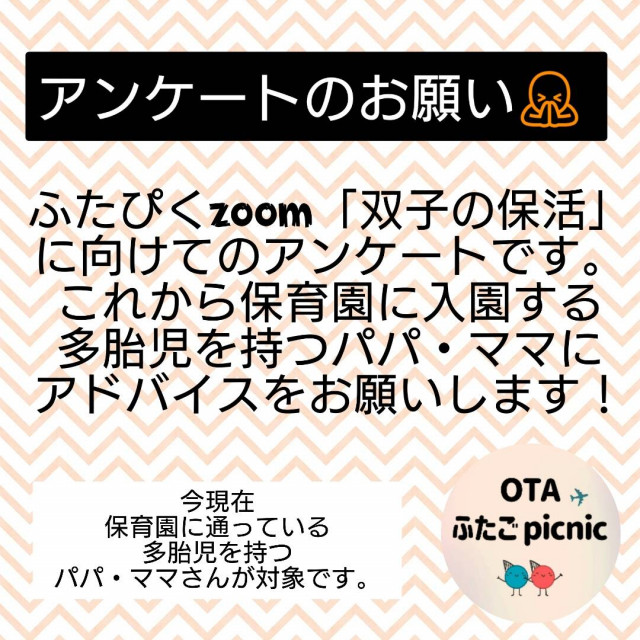 つきましては、現在、多胎児を保育園へ通わせているパパさん・ママさんにアンケートのご協力をお願いいたします。
