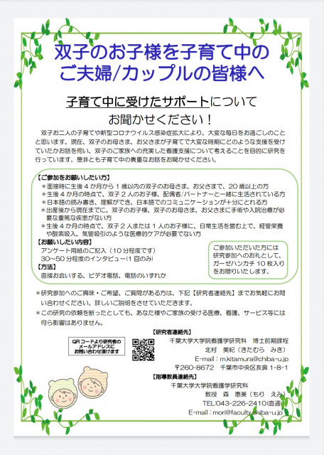 研究の対象は、1歳以内の双子のお子様を養育中のお父さま、お母さまです。方法は、Zoomや電話を用いた、30分程度のインタビューを予定しております。