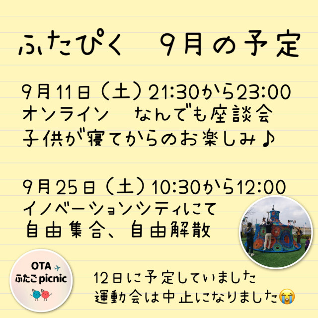 先日もお伝えいたしましたが、9/12に予定しておりました運動会は、会場都合により使用できなくなってしまいました。他会場を検討しましたが、残念ながら運動会は中止とします。