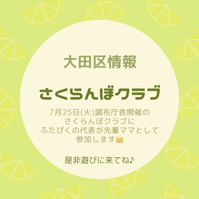 尚、7月と2月に調布庁舎で開催されるさくらんぼクラブには、ふたぴく代表も先輩ママとして参加致します♫