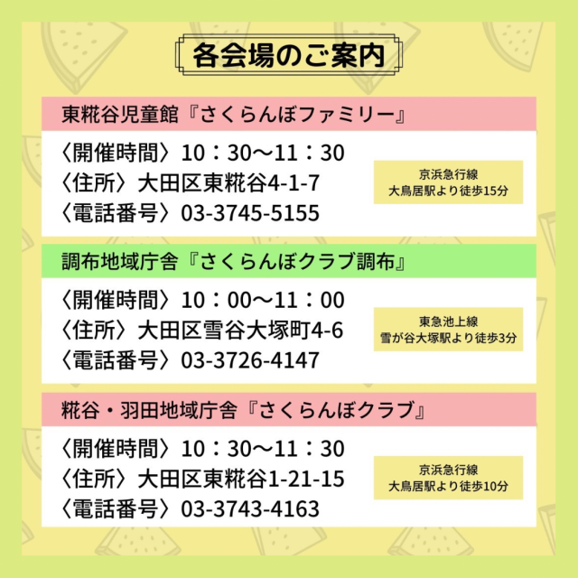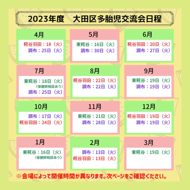 /大田区の地域庁舎(調布、糀谷・羽田)と東糀谷児童館で開催されている多胎児交流会の日程をお知らせいたします。