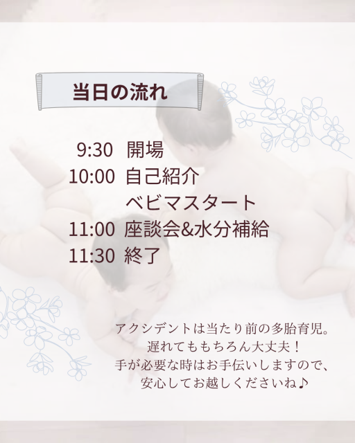ふたごやみつごでも参加できるように、通常よりゆっくりと進めていきます。お子さんとふれあいながら、育児の悩みや多胎あるあるについてお話しませんか?▪️日時