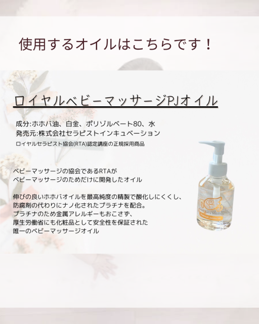 ・オムツ着用の裸でベビーマッサージ用のオイルを使用して実施していきますが、オイルの使用は保護者の方の判断にお任せします。※使用希望の方は受付時にオイルのテストをさせていただきます。
