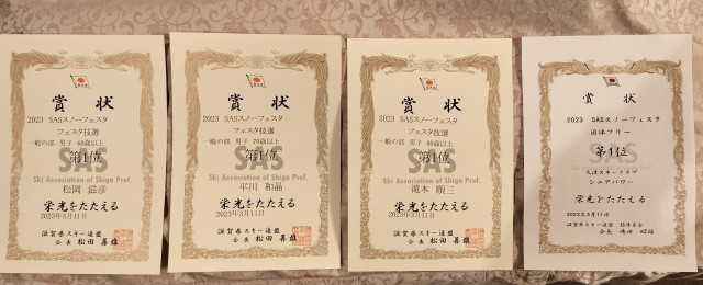 団体戦フリーで初めて1位となりました。(八方尾根での練習の甲斐あり) また、技術選では80歳代で滝本様、70歳代で平川様、60歳代で松岡様が1位になられました。おめでとうございます。