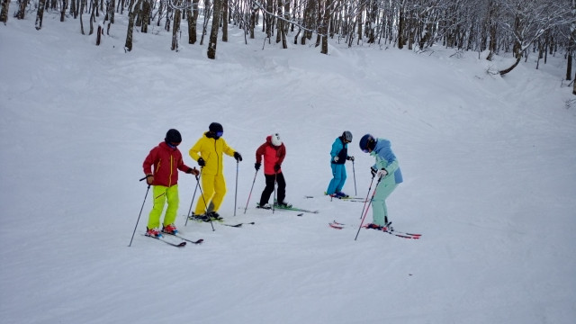 ダイヤモンドコース以外はほとんど未圧雪であり、ダイヤモンドコースで基礎課程を講習 谷回りの際に まずセンターポジションに戻し次のターンに入ることを確認願った。