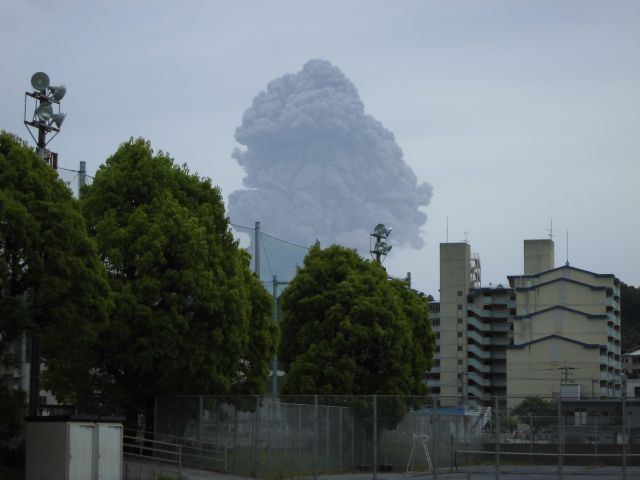 桜島の降灰に悩まされる昨今、練習中も爆発が…。