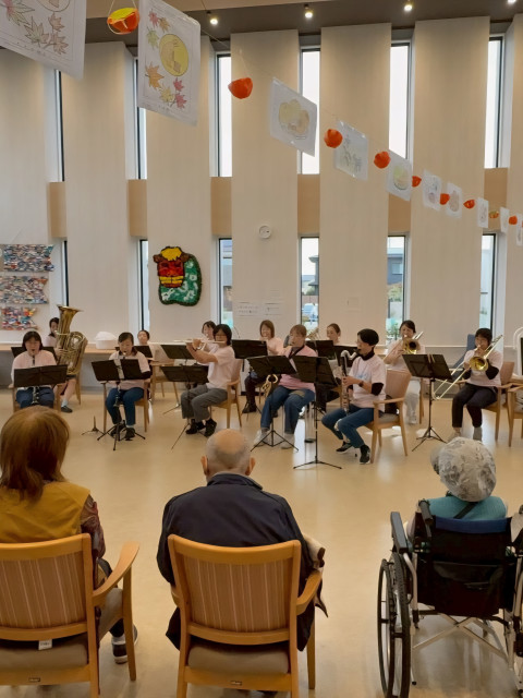 演奏終了後、涙してくださる利用者さまがおられたり、吹奏楽経験のある職員の方に温かいお声掛けをいただき、隊員も心温まる訪問演奏となりました。