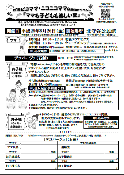 イベント申し込み用紙は活動日にお持ちいただくか、メールでお申し込みください。件名:デコパージュ、内容:ママのお名前と連絡先、お子様のお名前と年齢