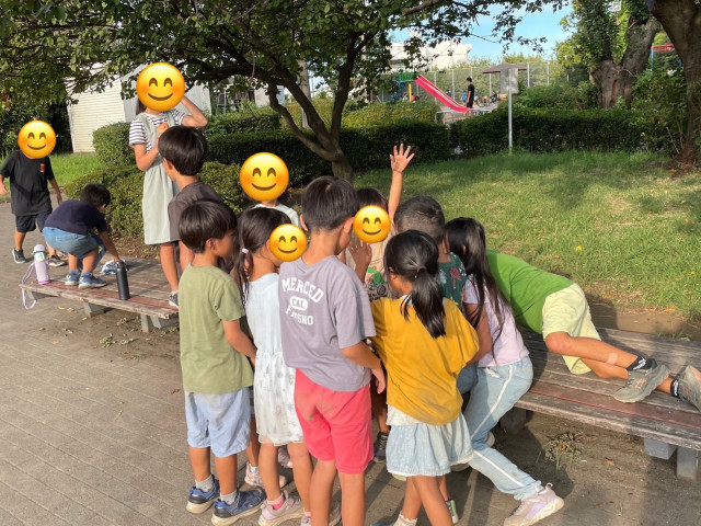 お勉強後に一日の流れを確認してから自由遊びしました。外で虫取り一輪車、サッカー、バスケで遊びました。