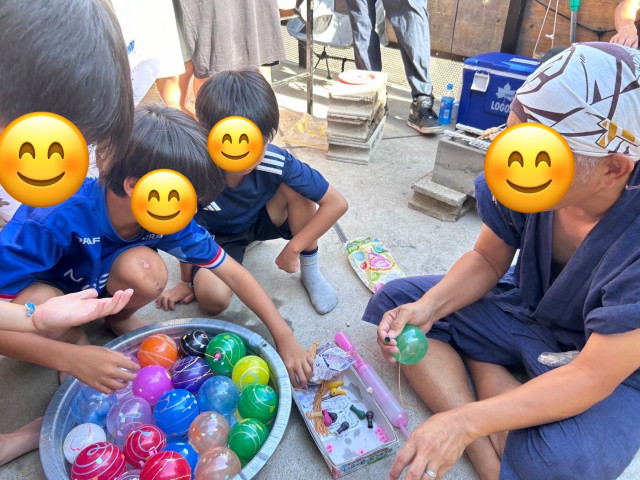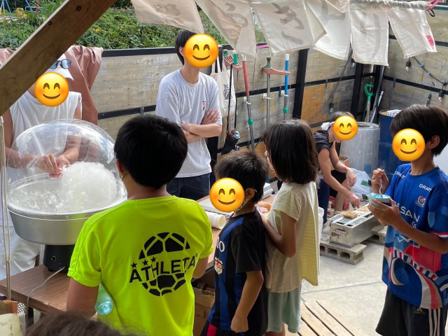 かき氷、くじ引き、焼きそば、チョコバナナ、ラムネ、焼き鳥、しゃてき+αで、サプライズのお店【わたあめ、ピザ、ヨーヨー釣り】が増えました。