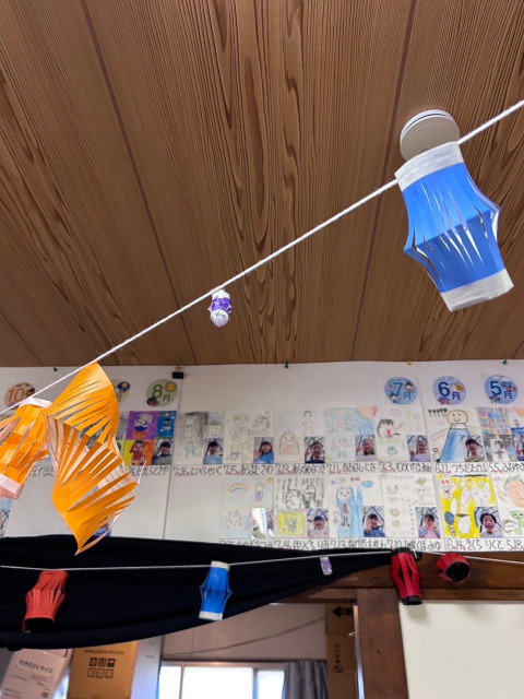 お店当番しない子も折り紙で提灯作りや、飾りつけをしました。
