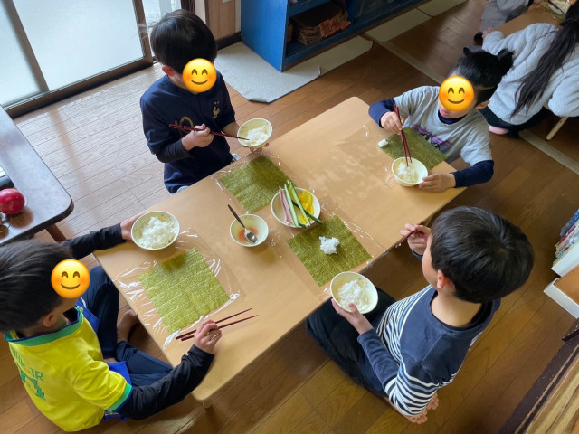 1人一つ恵方巻きを巻いて、西南西を向いて静かに目を瞑って食べました。