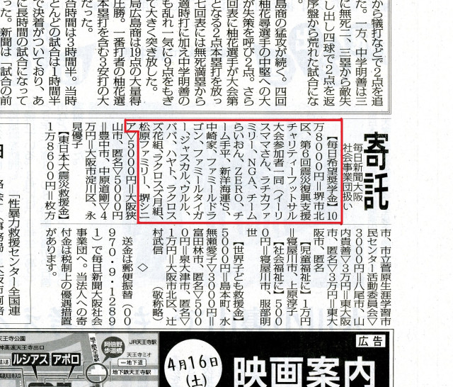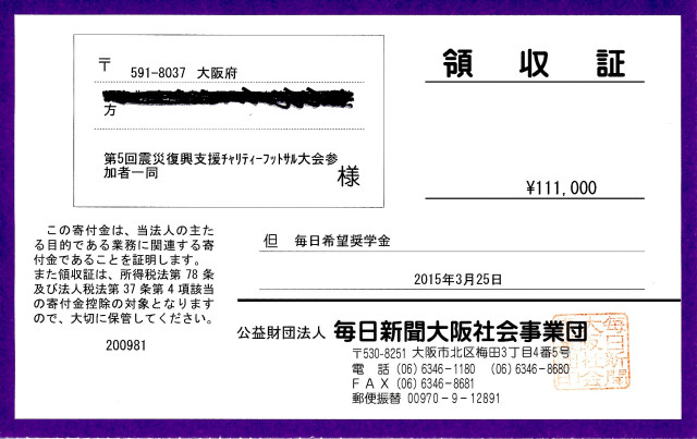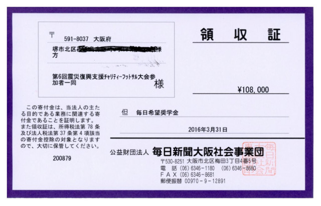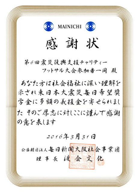 堺サッカー連盟は、東日本大震災後2011から、シニアの部中心にチャリティーフットサル大会を開催し、集まった募金を被災地の支援にご寄付させて頂いています。