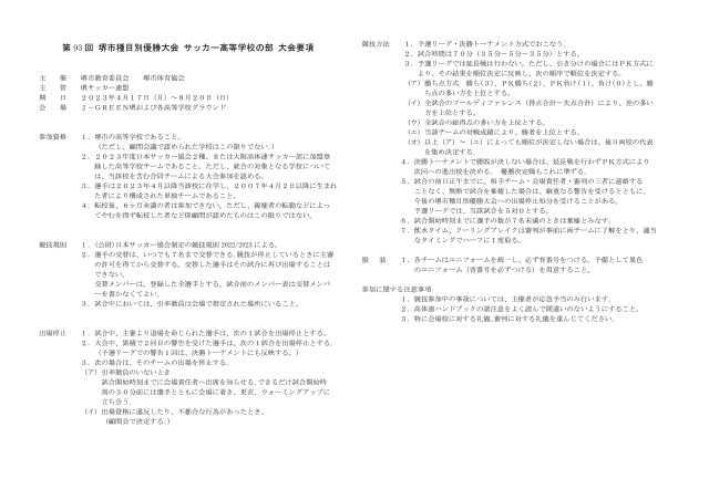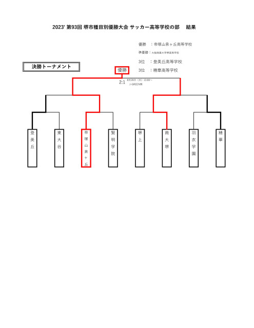内容 堺市種目別優勝大会 サッカー高等学校の部は、例年通り5月より予選リーグを行い、7月より各リーグ1位による決勝トーナメントが行われました。