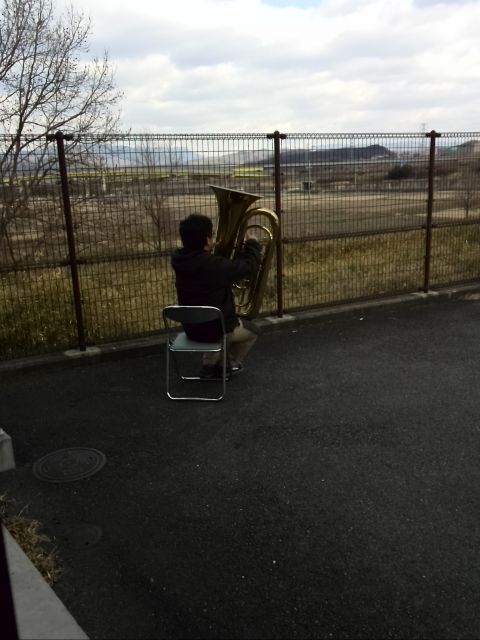 T君は、愛するチューバを連れて寒空の中、外練(笑)