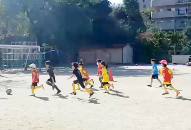 かけっこ、コーンを使ったサイドステップ、鬼ごっこ(背中タッチ)、一対一、ミニゲーム