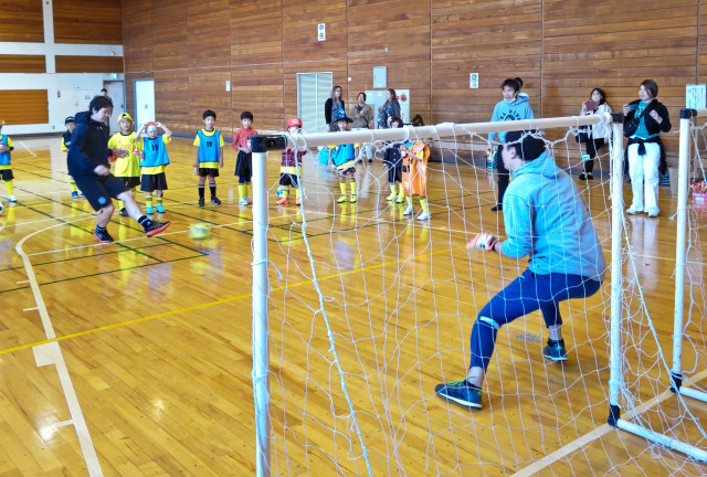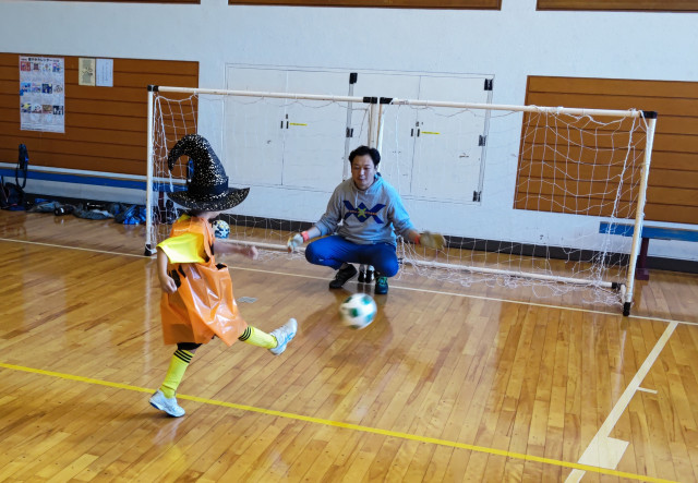 いつもの黄色ユニフォームからおのおのコスチュームに着替えて、キーパーコーチ相手にPK戦!