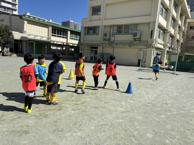 まずはウォーミングアップからスタート。体を動かしながら、ボールを使ったアップやジグザグリレーなどを楽しく取り組みました。