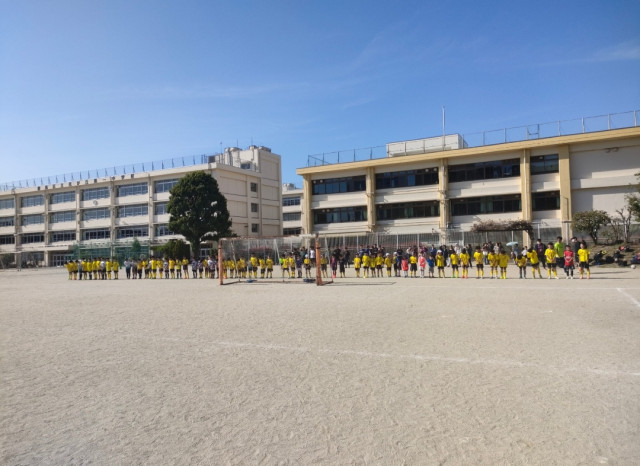 その後は、2年〜6年の全員でグラウンドあいさつ、グラウンド1周ジョグ、巨大な円?になって準備運動をしました。