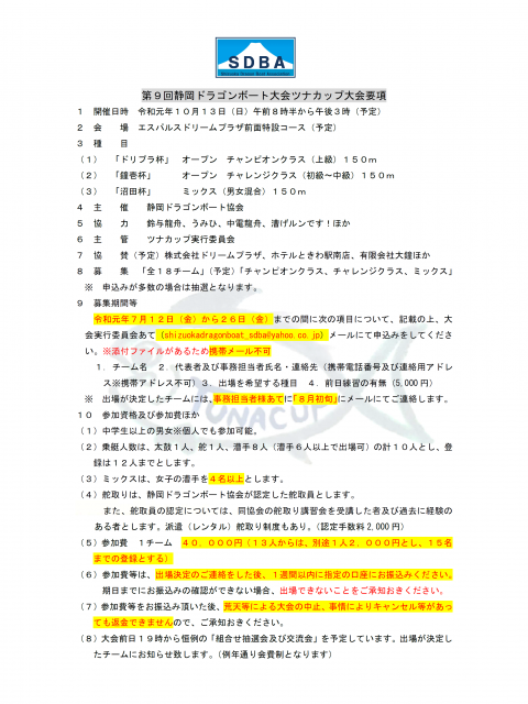 第9回静岡ドラゴンボート大会ツナカップ大会要項