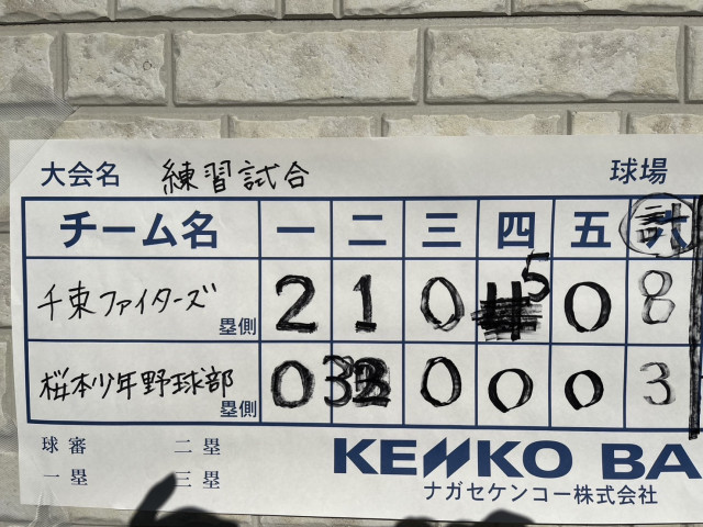 試合報告 練習試合 vs 桜本少年野球部 第1試合 ○8-3 投手 エイタ→イチタロウ→エイタ→ユウキ 捕手 ユウキ→エイタ 第2試合 ○0-3 投手 マナト→ショウマ 捕手 イチタロウ HR ユウキ✨ 応援ありがとうございました📣