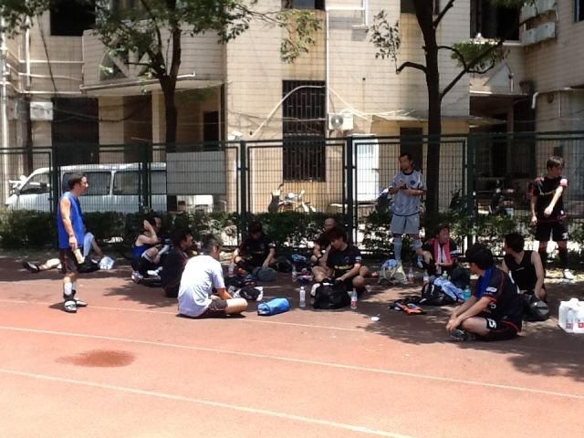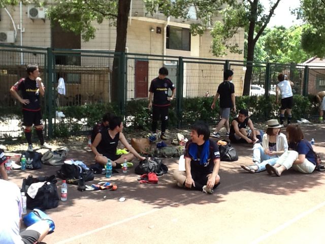 (ハーフタイム中に日陰で休憩を取るSSBメンバー達)