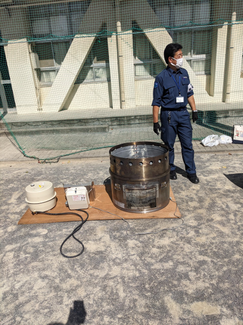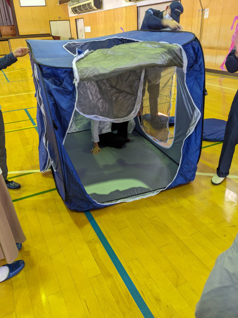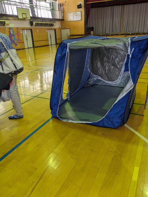 牛込第1中学校で避難所の開設訓練が催されました。日頃、見慣れた避難所で使用される体育館のほか、新しい滞在用テント、炊き出しの用具が紹介されましたので、写真を撮ってきました。