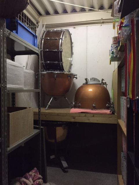 練習中の写真が撮れなかったのですが、打楽器を全部倉庫に入れないといけないのがこの時期の悩みです😱ここにティンパニ6台と鍵盤4台とドラムセットとその他小物類が収まってます(ティンパニ1台は吹奏楽団「湊」さまよりお借りしております。ありがとうございますm(_ _)m)