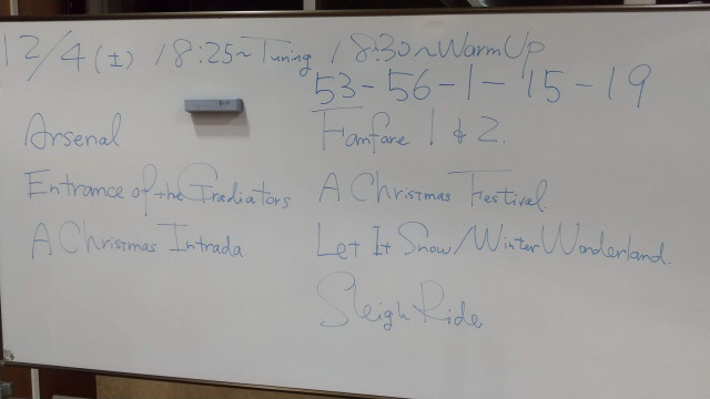 ■参加: 計 34 名 指揮者:1、フルート: 4、オーボエ/ファゴット: 1、クラリネット: 5、サックス: 4、トランペット: 4、ホルン: 3、トロンボーン: 3、ユーフォニアム: 2、 テューバ: 1、パーカッション: 5、String Bass: 1