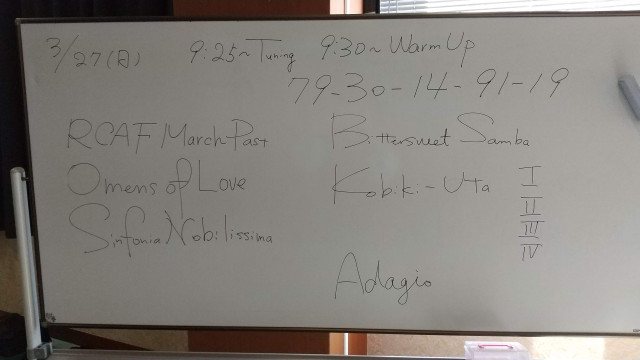 ■参加: 計 26 名 指揮者:1、フルート: 3、オーボエ/ファゴット: 0、クラリネット: 6、サックス: 3、トランペット: 2、ホルン: 1、トロンボーン: 3、ユーフォニアム: 2、 テューバ: 0、パーカッション: 4、String Bass: 1