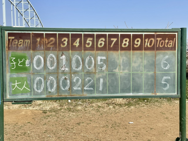 監督・コーチ陣が特大ヒットで先制するも、最終回で子チームの見事な連続安打で5得点し大逆転しました!