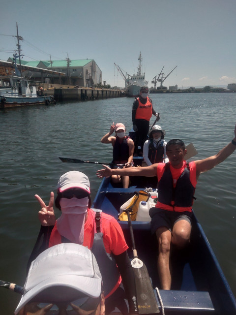 雲一つないボートの日和の中、海上安全指導員のメンバーから港の境界線などの豆知識などをはさみつつ、約1時間の気持ちいいのんびりパドリング(後ろの船は海上保安庁の巡視船です)。