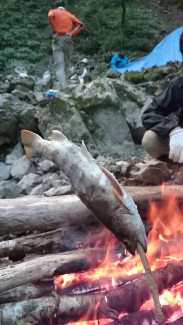 夜も焚き火にアマゴの塩焼き、豚味噌鍋、もらいものの焼酎、ウィスキーに満天の星と楽しかった。