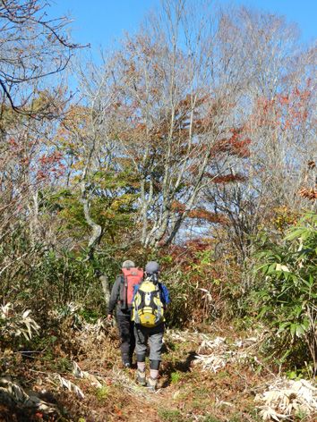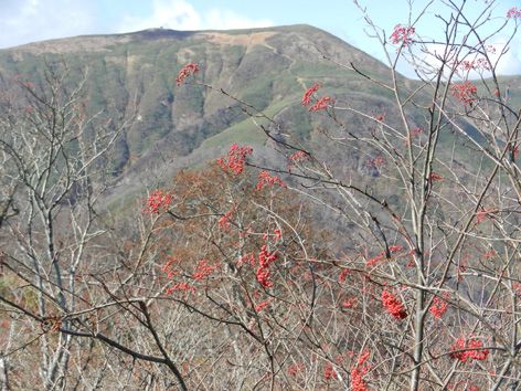 25日7時にスタート。以前に登った時は登山口まで車で入れましたが、林道にゲートが新設されていて、登山口まで林道を約1時間歩きとなりました。登るにつれて紅葉が色づき、稜線は葉を落として冬支度でした。11時過ぎ、頂上着。30分少し、頂上付近散策しながら、休憩。正午前に下山スタート、15時林道ゲートに到着、終了。
