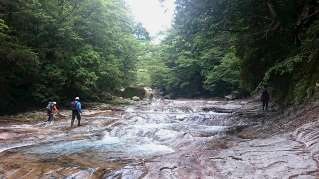 トラロープのある左岸を巻き上がり、滝の上の渡渉もお助けひもで無事通過。これでホット一息あとはナメを楽しむばかりです。これぞ前鬼。
