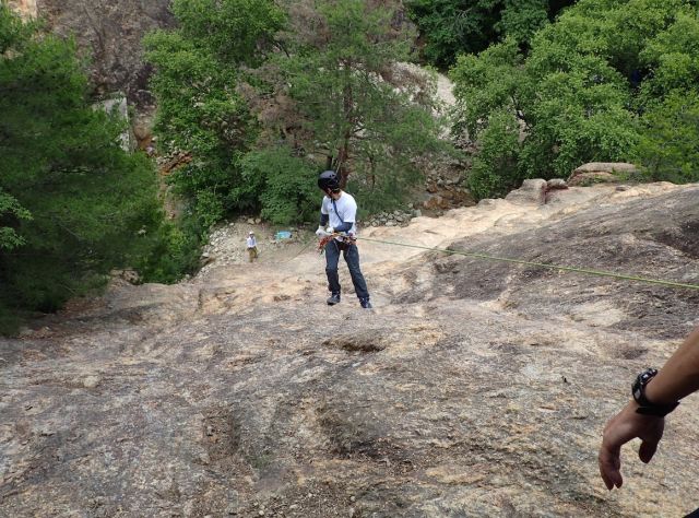 その後、懸垂下降の復習をしました。懸垂下降は練習でやるのは楽しいですが、手順を間違えると重大事故につながります。何度も何度も練習出来ました。受講生のみなさんは前回より動きがスムーズになっていました。