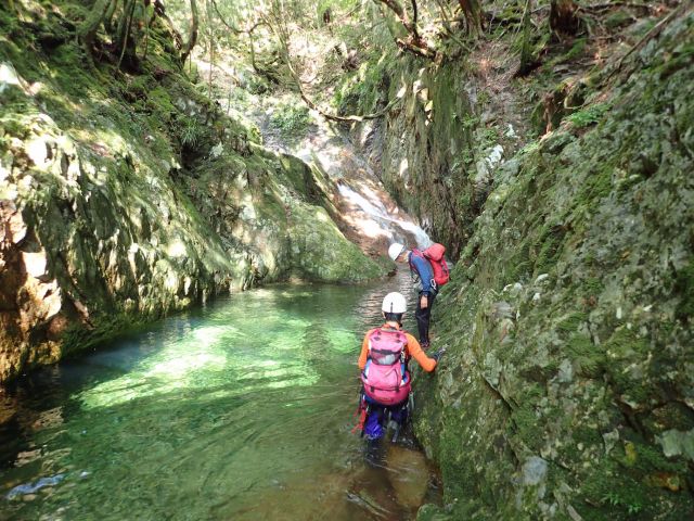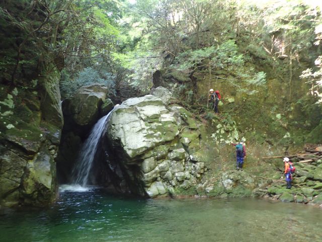 前夜泊した下北山村は天の川が見えるほどの見事な星空でした。次の日の沢登りに期待が膨らみましたが、期待通り、いや期待以上に素晴らしい沢登りとなりました。雨が少なかったために水量も多くなく、とても快適な沢でした。適度な釜を持った滝が多く、泳いだり、へつったりと水の中に入って滝に取り付いて登るという私の「沢登り」のイメージにピッタリの沢でした。大きな滝があるわけではありませんが、大滝を登る技量がない私には怖くてきつい高巻きをしなくてすみます。やさしすぎず、難しすぎずコンパクトに沢登りの醍醐味がギュギュッと詰まっています。下山も先週の中ノ谷が最後まで緊張を強いられたのに対し、ここはどこからでも林道に上がりさえすれば大丈夫という安心感があります。水は当然澄み切っており前鬼ブルーに勝るとも劣らない池郷ブルーです。いやーもう内緒にしておきたいぐらい良かったです。まだまだ他にも素敵な沢というのはいっぱいあるでしょうが、この大又谷は私の中ではちょっとポケットにしまっておく、何かの時にまた行きたい、という大絶賛の沢です。みんな無事で、と言いたいところですが、トリピーさんがこけて突き指をしてしまいました。膝やわきも打ち身とのことですが、ひどくなってなければよいのですが。楽しいといっても危険と隣り合わせの沢登り、これからも安全には気をつけて行きたいと思います。
