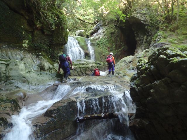 参考タイム:林道車止め(6:55)ー大又谷入谷(7:15ちょっとだけ下流を見に行き、もどる7:45)ー右側に洞窟のある7mの滝(8:40)ーチョックストーンの滝(8:50)ー本谷とミキヨ谷の二又(11:00左のミキヨ谷へ)ー地形図798の8ではなく7の方の枝沢(水の流れあり)を標高100mほどつめる(11:30)ー左側の尾根にとりつき林道へ(12:00)ー車止め(12:45)